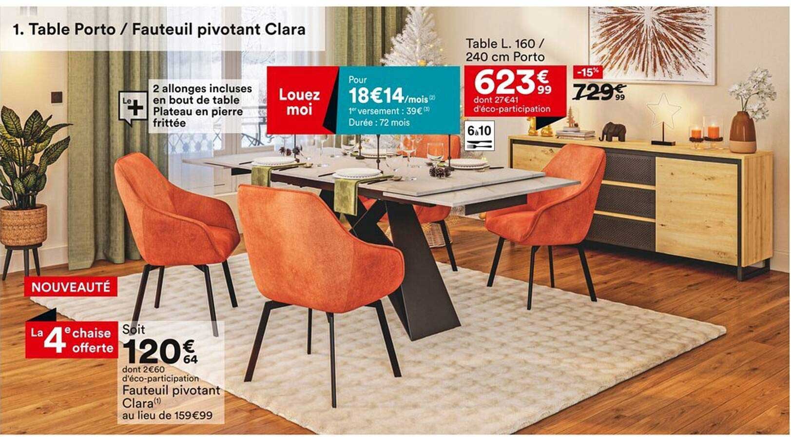Découvrez une offre exceptionnelle sur la table Porto et le fauteuil pivotant Clara, parfaite pour ajouter une touche moderne et conviviale à votre salle à manger. Cette ensemble allie esthétisme et fonctionnalité, idéale pour les repas en famille ou entre amis.