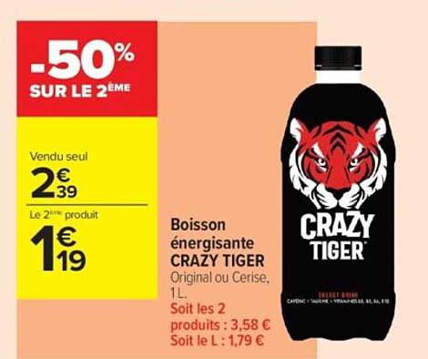 La boisson CRAZY TIGER, grâce à ses saveurs uniques et à sa formule énergisante, est parfaite pour les sportifs, les étudiants ou quiconque ayant besoin d'un regain d'énergie. Avec une offre de -50% sur le deuxième produit, c'est l'occasion idéale de partager ce moment rafraîchissant avec un ami.