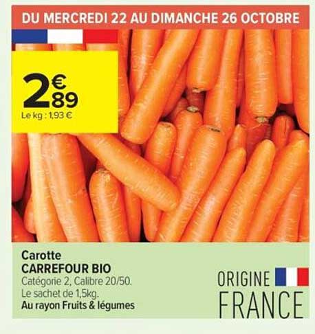 Découvrez les carottes bio de Carrefour, un véritable incontournable de votre alimentation saine. Ces carottes, issues de l'agriculture biologique, sont non seulement délicieuses, mais également idéales pour une variété de plats, des salades aux soupes. Profitez d'une offre exceptionnelle valable du 22 au 26 octobre !