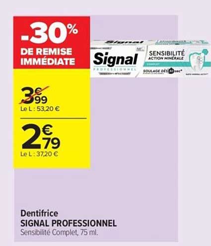 Si vous recherchez un dentifrice de qualité pour soulager la sensibilité dentaire, le dentifrice SIGNAL PROFESSIONNEL est fait pour vous ! Profitez d'une remise immédiate de 30% sur ce produit, idéal pour préserver votre santé bucco-dentaire tout en faisant des économies.