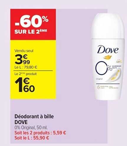 Découvrez notre offre exceptionnelle sur le déodorant à bille DOVE 0% Original. Ce produit, à la fois efficace et doux, est parfait pour ceux qui recherchent une protection longue durée tout en prenant soin de leur peau. Pendant la période de promotion, vous avez la possibilité de bénéficier d'une réduction sur le deuxième produit, ce qui rend cette offre encore plus intéressante !