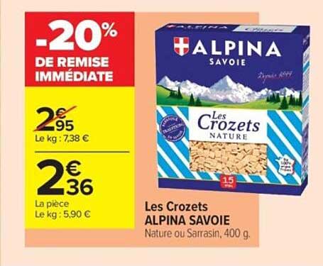 Découvrez les Crozets ALPINA SAVOIE, un délice de la cuisine savoyarde qui ravira les papilles de toute la famille. Que vous soyez un amateur de cuisine ou simplement à la recherche d'un plat simple et savoureux, ces petits pâtes sont idéales pour vos repas du quotidien. Profitez dès maintenant de cette offre exceptionnelle, valable jusqu'au 2 novembre 2025, pour vous régaler tout en réalisant des économies.