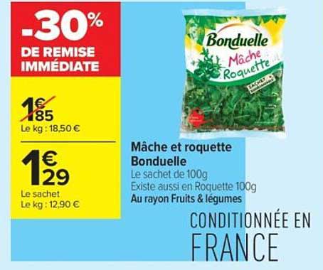 Conditionnée en France, la mâche et roquette Bonduelle est préparée avec des matières premières de qualité. Cette variété existant aussi en roquette 100g garantit une diversité que les amateurs de légumes apprécieront.