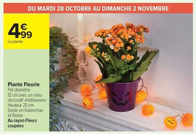 Du mardi 28 octobre au dimanche 2 novembre, profitez d'une magnifique Plante Fleurie à 4,99 € ! Cette plante à la fois colorée et décorative saura embellir votre intérieur avec une touche de fraîcheur et de gaieté, parfaite pour la saison automnale.