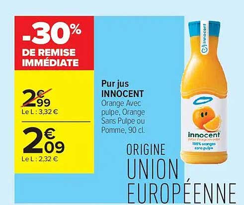 Profitez d’une offre exceptionnelle sur le Pur jus INNOCENT, disponible en plusieurs variétés telles que l'orange avec pulpe ou sans pulpe, ainsi que pomme. C'est l'occasion idéale de savourer des jus de fruits de qualité, à un prix réduit durant une période limitée.