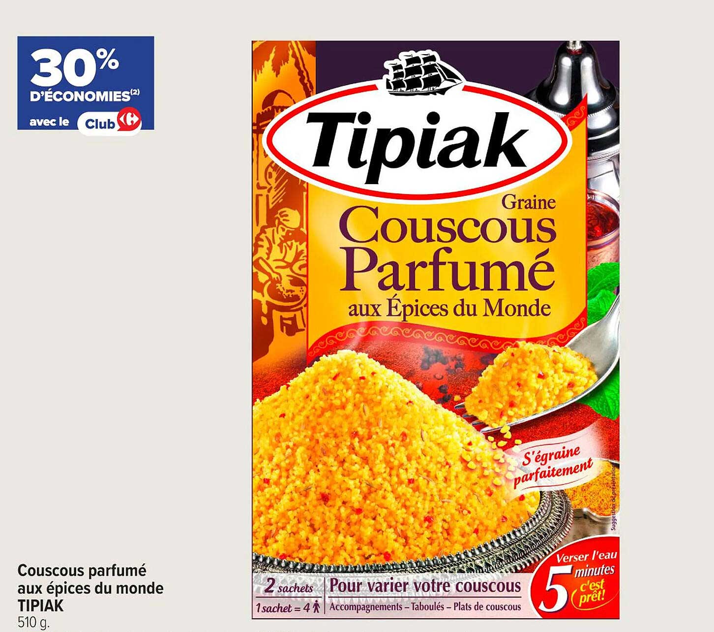 Cette promotion sur le couscous parfumé TIPIAK est une occasion en or pour tous les amateurs de bonne cuisine. Avec ses épices du monde, ce couscous transforme vos repas en véritables expériences gustatives. Que ce soit pour un dîner en famille ou un repas entre amis, ce produit saura séduire vos convives.