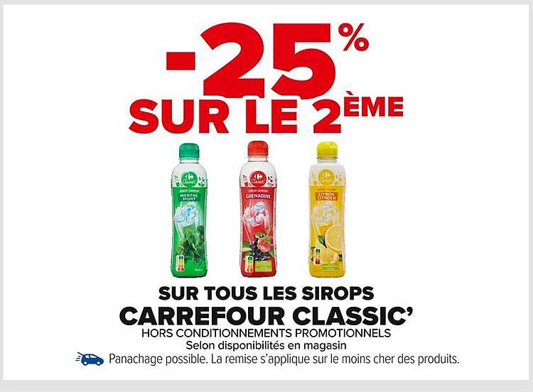 Découvrez une promotion exceptionnelle sur les sirops Carrefour Classic ! À partir du 21 octobre 2025, vous pouvez bénéficier de -25% sur le deuxième sirop acheté. Que vous soyez fan de grenadine, de menthe ou de citron, il est temps de rehausser vos boissons avec ces saveurs irrésistibles. Parfait pour égayer vos cocktails, sodas ou simplement vos eaux gazeuses, ce sont des indispensables pour toute occasion.
