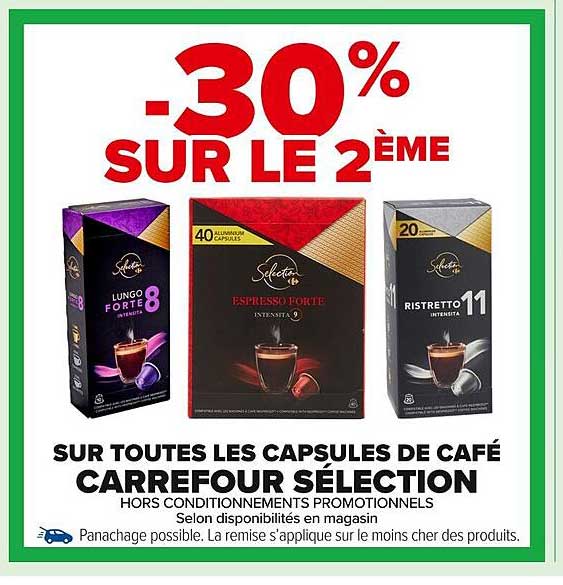 Vous êtes un amateur de café ? Cette promotion sur les capsules Carrefour Sélection pourrait bien vous ravir ! Profitez d'une remise de 30% sur le deuxième paquet de toutes les capsules de café. C'est l'occasion idéale de découvrir de nouvelles saveurs tout en faisant des économies. Croyez-moi, vos matinées n'ont jamais été aussi savoureuses !
