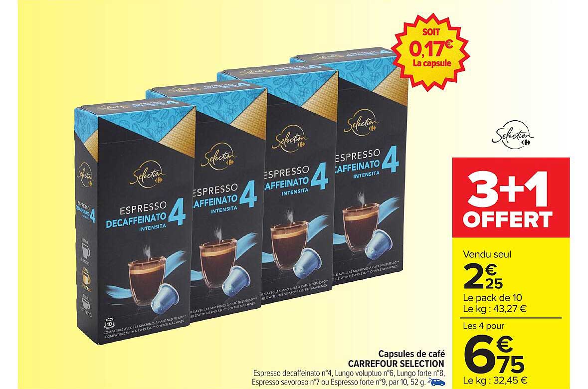 Amateurs de café, ne manquez pas cette incroyable promotion sur les capsules de café Carrefour Selection ! Profitez de l'offre exceptionnelle de 3+1 gratuit sur les capsules d'Espresso décaféiné Intensity 4, valable du 13 mai au 25 mai 2025. Il s'agit d'une occasion en or pour savourer un café de qualité, sans les joutes de la caféine !