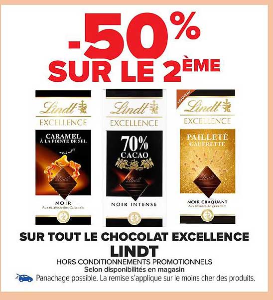 Vous êtes amateur de chocolat ? Cette promotion est faite pour vous ! Profitez d'une réduction de 50% sur le deuxième chocolat Excellence de la marque Lindt. Une occasion parfaite pour découvrir des saveurs uniques et raffinées, tout en allégeant votre note à la caisse.