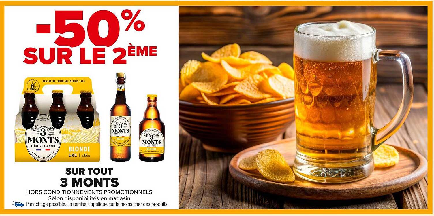 Découvrez notre promotion exclusive sur la bière 3 Monts, une bière blonde de caractère produite par une brasserie familiale depuis 1920. Profitez de -50% sur le deuxième pack, une occasion idéale pour partager un moment convivial entre amis ou en famille. Que vous soyez fan de bières ou simplement en quête d'une nouvelle saveur à explorer, cette offre est faite pour vous.
