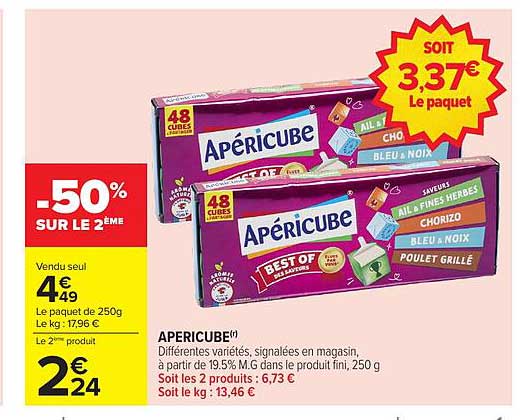 Découvrez la promotion exceptionnelle sur les célèbres Apéricube, un incontournable pour vos apéritifs et en-cas. Du 23 octobre au 10 novembre 2025, profitez de -50% sur le deuxième paquet. Ce fromage en cubes, apprécié pour sa variété de saveurs, ravira les papilles de tous vos convives. Pourquoi ne pas en profiter pour se faire plaisir tout en réalisant des économies ?