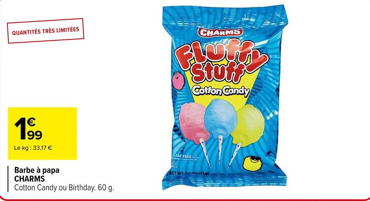 Découvrez dès maintenant la offre Barbe à papa CHARMS - Cotton Candy ou Birthday. 60 g. dans le catalogue de Carrefour Market. Cette offre est valable du 21/10/2025 au 03/11/2025.