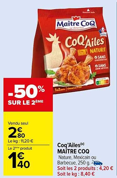 Découvrez l'offre de Coq’ailes Maître Coq chez Carrefour Market! Cette offre fantastique est maintenant disponible dans le nouveau catalogue de Carrefour Market. Profitez de cette occasion et économisez considérablement sur votre achat.