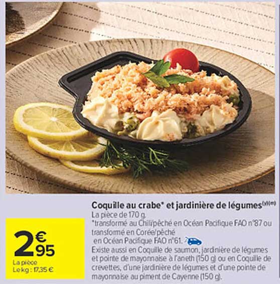 La promotion actuelle sur la Coquille au crabe* et jardinière de légumes est une occasion à ne pas manquer pour tous les amateurs de fruits de mer et de plats savoureux. Avec un prix attractif de seulement 2,95 € la pièce, cette offre met en avant un plat prêt à déguster qui allie saveur et qualité. Que vous cherchiez un repas rapide ou une entrée raffinée, cette préparation saura vous séduire.