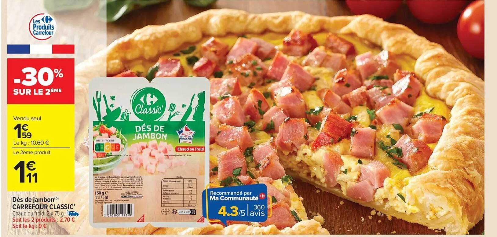 Découvrez une offre délicieuse sur les dés de jambon de Carrefour Classic. Parfaits pour agrémenter vos plats, ces dés de jambon sont une addition savoureuse qui ravira les papilles de toute la famille. Entre le 18 et le 30 novembre 2025, profitez d'une réduction exceptionnelle sur le deuxième produit acheté !