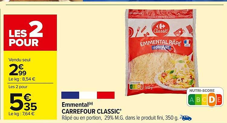 Actuellement, l'Emmental® CARREFOUR CLASSIC’ est vendu à 2,99 € l'unité, soit 8,54 € le kg. Cependant, avec l'offre « 2 pour », vous pouvez l'obtenir à seulement 5,35 € pour deux sachets, et cela revient à 7,64 € le kg. Une opportunité à ne pas manquer pour réaliser des économies tout en vous régalant.