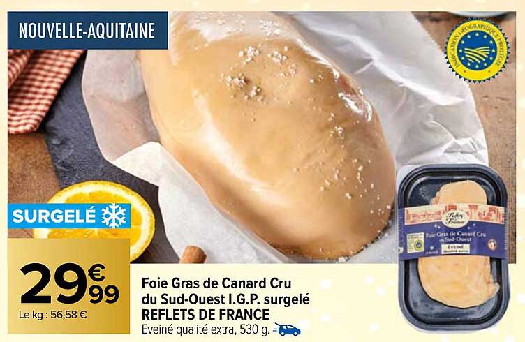 Offre de Foie Gras De Canard Cru Du Sud-Ouest I.g.p. Surgelé Reflets De France chez Carrefour Market