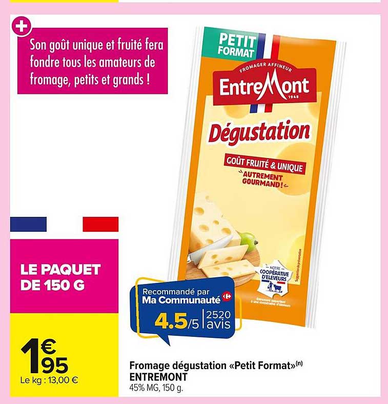 Découvrez le fromage dégustation «Petit Format» de la marque Entremont, qui saura ravir tous les amateurs de fromage. Avec son goût unique et fruité, ce fromage est idéal pour égayer vos apéritifs ou vos plats en toute simplicité. Profitez de cette offre exceptionnelle valable jusqu'au 2 novembre 2025 et laissez-vous séduire par ses saveurs gourmandes.