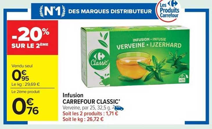 Vous cherchez une tasse de bien-être pour ponctuer vos journées ? Ne cherchez pas plus loin ! L'infusion CARREFOUR CLASSIC' à la verveine est la solution idéale pour vous apporter détente et sérénité. Avec cette promotion, vous bénéficierez d'une réduction de 20 % sur le deuxième paquet, une occasion à ne pas manquer !