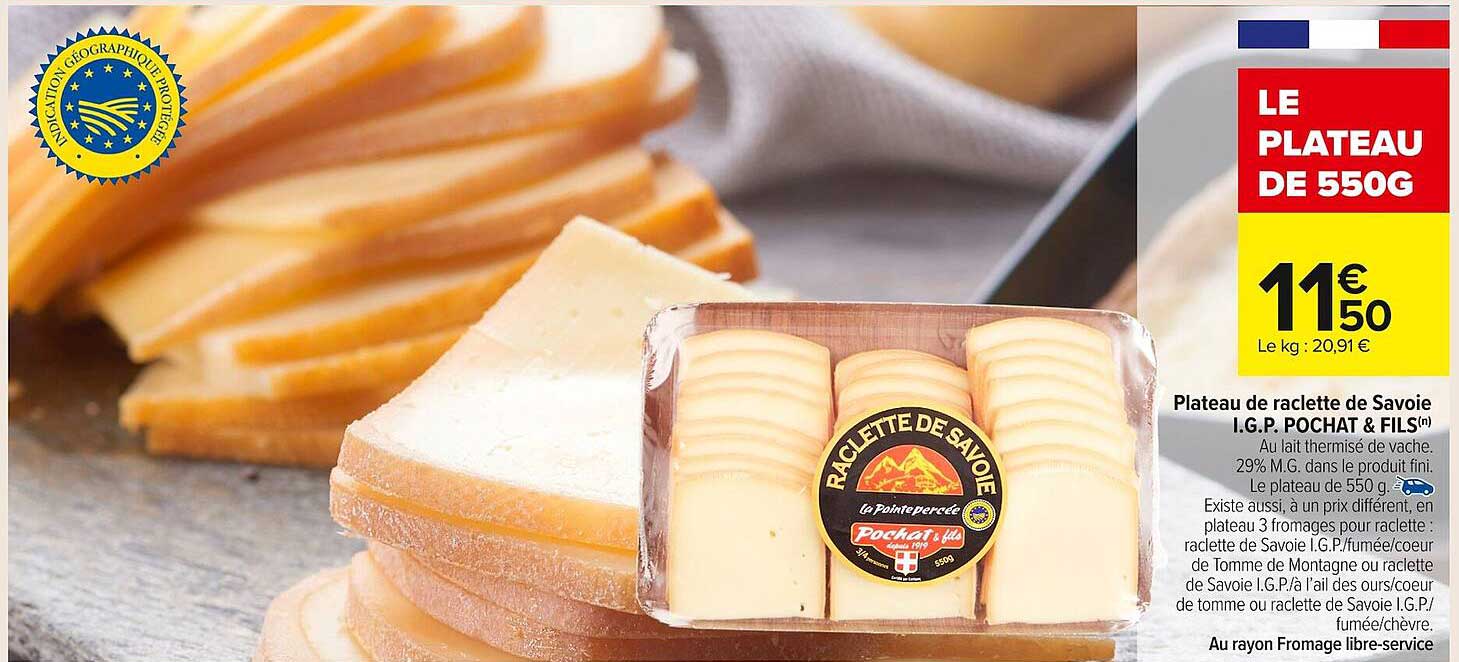 Retrouvez en ce moment une offre irrésistible sur le plateau de raclette de Savoie I.G.P. Pochat & Fils ! Ce produit, labellisé avec une indication géographique protégée, est parfait pour égayer vos soirées d'hiver. Que ce soit pour un repas convivial entre amis ou en famille, ce fromage savoureux apportera une touche authentique à vos plats.