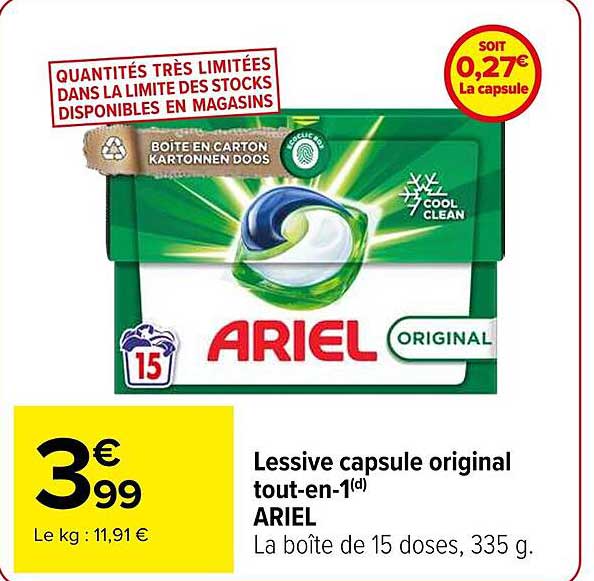 Découvrez dès maintenant la offre Lessive capsule original tout-en-1(d) ARIEL dans le catalogue de Carrefour Market. Cette offre est valable du 27/03/2025 au 07/04/2025.