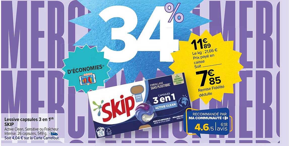 Découvrez l'offre de Lessive Capsules 3 En 1 Skip chez Carrefour Market! Cette offre fantastique est maintenant disponible dans le nouveau catalogue de Carrefour Market. Profitez de cette occasion et économisez considérablement sur votre achat.