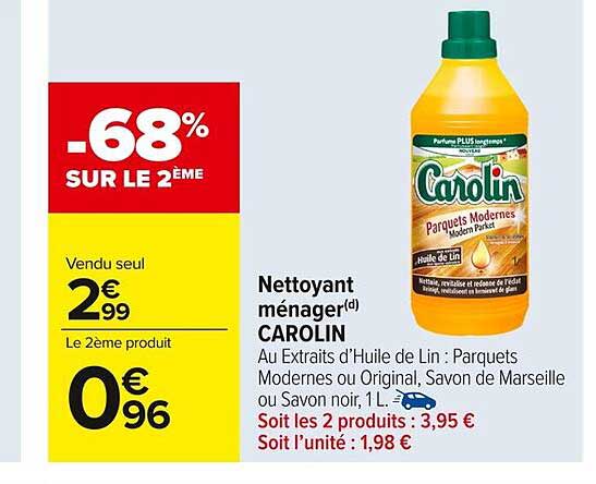 Découvrez l'offre exceptionnelle sur le nettoyant ménager CAROLIN, idéal pour entretenir vos parquets et autres surfaces. Avec un parfum agréable, il élimine efficacement la saleté tout en apportant brillance et protection. Profitez de -68% sur le deuxième produit, une occasion à ne pas manquer pour faire le plein de produits de nettoyage à petit prix !