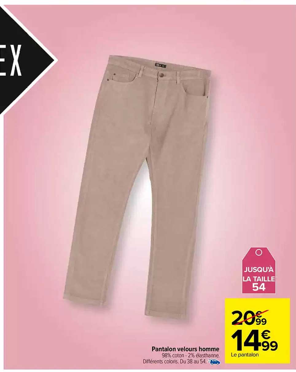 Découvrez l'offre de Pantalon Velours Homme chez Carrefour Market! Cette offre fantastique est maintenant disponible dans le nouveau catalogue de Carrefour Market. Profitez de cette occasion et économisez considérablement sur votre achat.