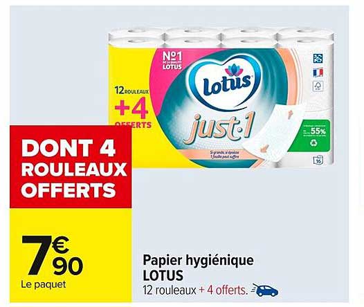 Vous cherchez une offre pratique et économique pour vos besoins quotidiens ? Ne manquez pas cette promotion sur le papier hygiénique Lotus. Pour seulement 7,90 €, vous obtenez un paquet de 12 rouleaux avec 4 rouleaux supplémentaires offerts. C'est l'occasion parfaite de faire le plein tout en réalisant des économies !