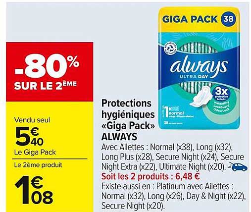 Découvrez dès maintenant l'offre exceptionnelle sur le Giga Pack de protections hygiéniques ALWAYS, une solution fiable pour votre confort quotidien. Enceinte entre le 14 et le 26 octobre 2025, cette offre vous permet d'accéder à des protections de haute qualité à un prix défiant toute concurrence.