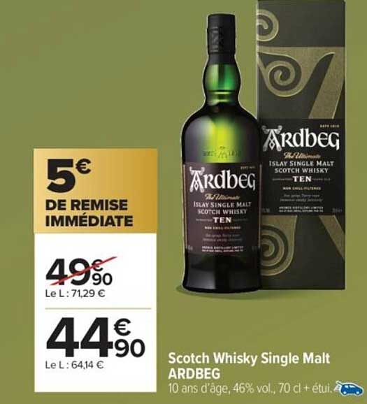 Vous êtes à la recherche d'un whisky d'exception ? Ne manquez pas l'offre incroyable sur le Scotch Whisky Single Malt ARDBEG. Ce whisky de 10 ans d'âge, provenant de l'île d'Islay, est un parfait mélange de saveurs riches et intenses. Actuellement, il est proposé en promotion, vous permettant ainsi de découvrir ou de redécouvrir ce classique à un prix exceptionnel.
