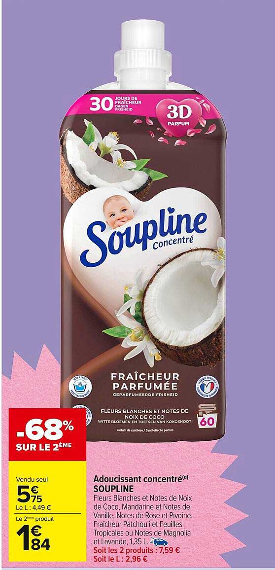 Découvrez l'offre de Soupline Concentré Fraîcheur Parfumée chez Carrefour Market! Cette offre fantastique est maintenant disponible dans le nouveau catalogue de Carrefour Market. Profitez de cette occasion et économisez considérablement sur votre achat.