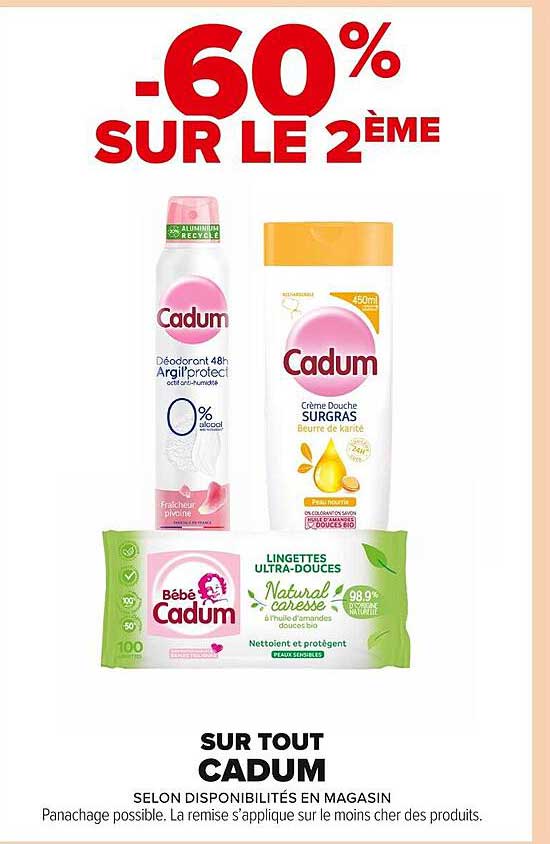 Découvrez la superbe offre de Sur Tout Cadum dans le nouveau catalogue de Carrefour Market. En plus de cette offre, vous trouverez de nombreuses autres réductions attrayantes. Vous pouvez facilement commander le Sur Tout Cadum en ligne via le site web de Carrefour Market ou l'acheter dans un magasin près de chez vous.