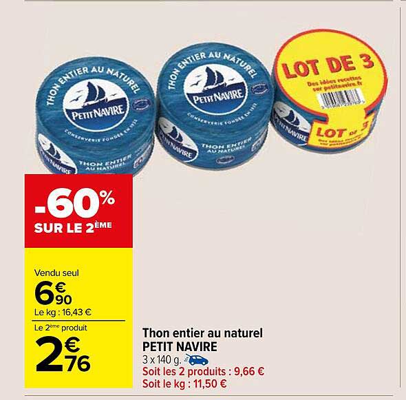 Découvrez l'offre de Thon Entier Au Naturel Petit Navire chez Carrefour Market! Cette offre fantastique est maintenant disponible dans le nouveau catalogue de Carrefour Market. Profitez de cette occasion et économisez considérablement sur votre achat.