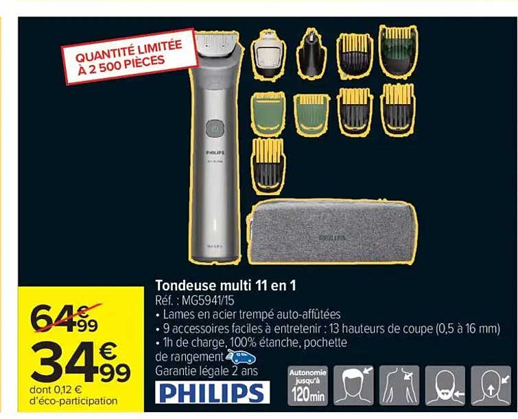 Vous cherchez une solution pratique pour entretenir votre look ? La tondeuse multi 11 en 1 de Philips est l'outil qu'il vous faut ! Avec ses multiples accessoires et ses lames en acier trempé auto-affûtées, cette tondeuse est conçue pour vous offrir une coupe précise et adaptée à tous vos besoins, le tout à un prix imbattable.