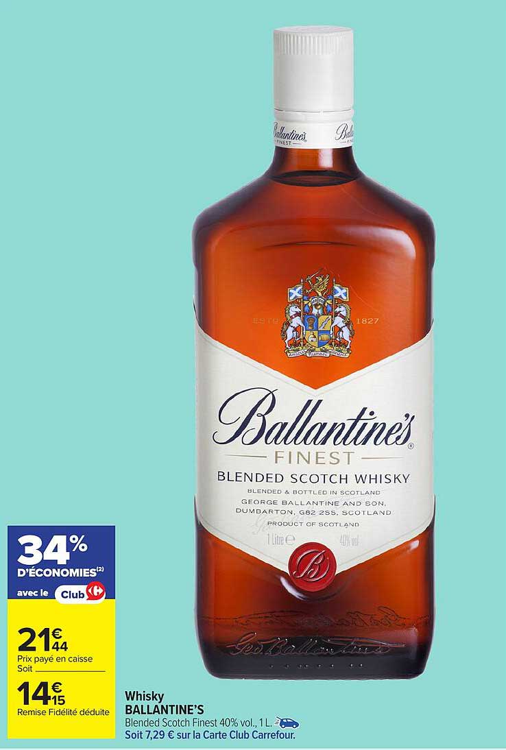 Découvrez l'offre de Whisky Ballantine's chez Carrefour Market! Cette offre fantastique est maintenant disponible dans le nouveau catalogue de Carrefour Market. Profitez de cette occasion et économisez considérablement sur votre achat.