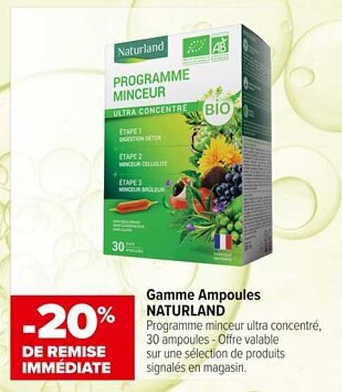 Profitez d'une remise immédiate de 20 % sur ce programme minceur ! C'est une occasion en or, surtout lorsque l'on connaît le prix habituel de produits similaires. En choisissant le Programme Minceur de NATURLAND, non seulement vous optez pour un produit de qualité, mais vous faites également des économies.