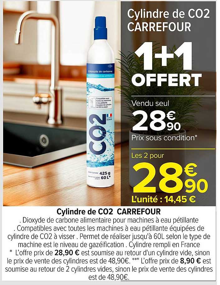 Découvrez une offre exceptionnelle sur le cylindre de CO2 de Carrefour, idéal pour ceux qui apprécient les boissons pétillantes faites maison. Cette promotion, valable du 15 au 28 juillet 2025, vous permet de faire le plein de fraîcheur tout en réalisant des économies. Avec l'achat de deux cylindres de CO2 au prix de 28,90 €, le second est offert ! C’est une belle occasion de tester votre machine à eau pétillante et d’impressionner vos amis avec des boissons gazeuses faites à la maison.
