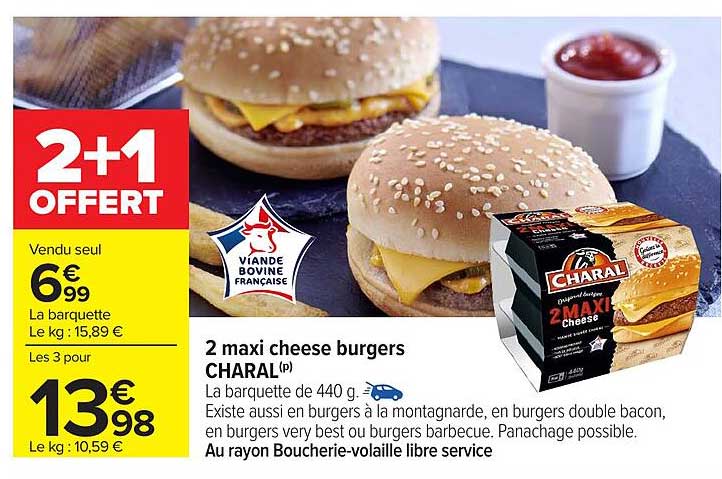 Découvrez l'offre de 2 Maxi Cheese Burgers Charal chez Carrefour! Cette offre fantastique est maintenant disponible dans le nouveau catalogue de Carrefour. Profitez de cette occasion et économisez considérablement sur votre achat.