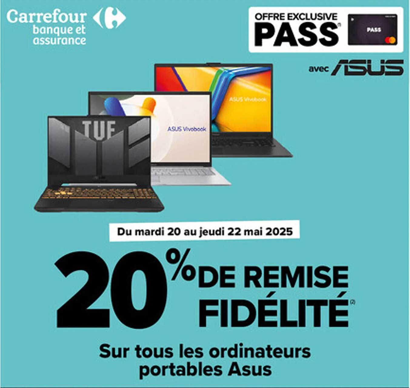 Découvrez dès maintenant la offre 20% de remise fidélité sur tous les ordinateurs portables Asus dans le catalogue de Carrefour. Cette offre est valable du 20/05/2025 au 22/05/2025.