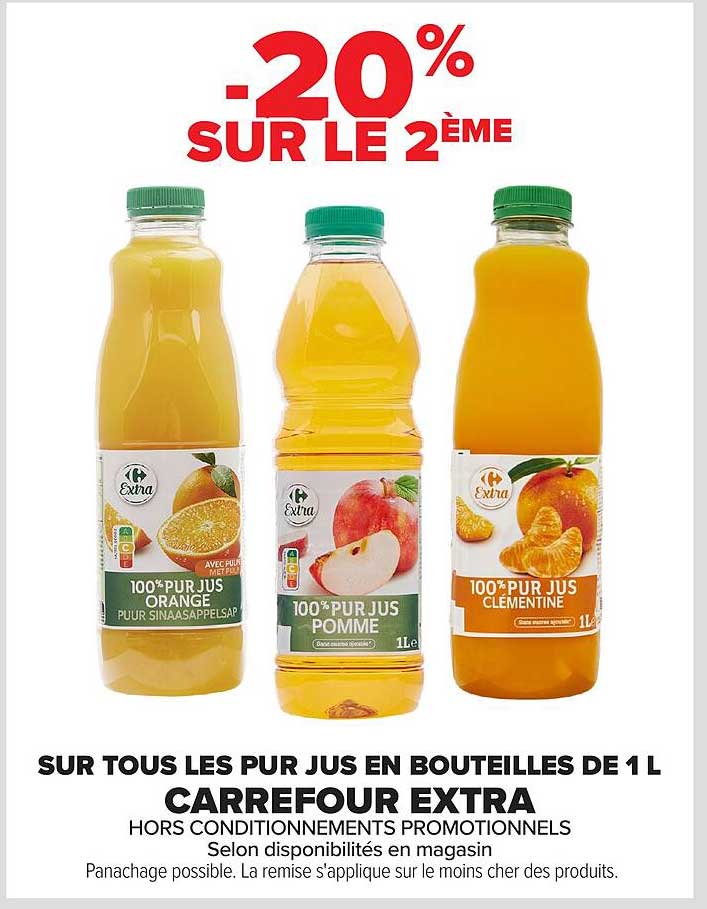 Profitez d'une réduction exceptionnelle de 20% sur le deuxième lot de jus en bouteilles de 1 L, valable exclusivement chez Carrefour, du 7 au 20 octobre 2025. C'est une opportunité fantastique pour les amateurs de jus frais et savoureux.