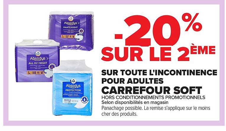 Découvrez l'incroyable promotion sur les produits Absodys pour adultes, exclusivement chez Carrefour ! Profitez d'une réduction de 20% sur le deuxième produit acheté, ce qui rend cette offre encore plus attirante pour ceux qui recherchent des solutions d’incontinence.