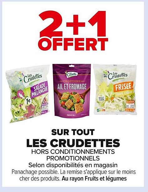 Les Crudettes s'invitent dans votre cuisine avec une promotion irrésistible ! Profitez de l'offre 2+1 gratuit sur toute la gamme des Crudettes, idéal pour agrémenter vos salades et plats en un clin d'œil. Cette offre est valable du 09 au 22 septembre 2025, alors ne tardez pas à en profiter.