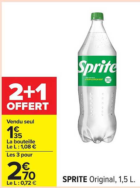 Normalement, une bouteille de Sprite est vendue à 1,35 €, soit 1,08 € par litre. Cependant, grâce à cette offre, vous pouvez acquérir trois bouteilles pour seulement 2,70 €, ce qui vous permet de réaliser d'importantes économies. C'est l'occasion rêvée de faire le plein de votre boisson préférée tout en préservant votre budget.