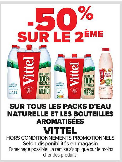 Cette offre exceptionnelle sur les packs d'eau naturelle et les bouteilles aromatisées de Vittel est une occasion à ne pas rater ! Du 16 au 29 septembre 2025, bénéficiez de 50 % de réduction sur le deuxième produit acheté. Que vous soyez un amateur d'eau pure ou que vous préfériez les saveurs fruitées, cette promotion saura satisfaire toutes vos envies.