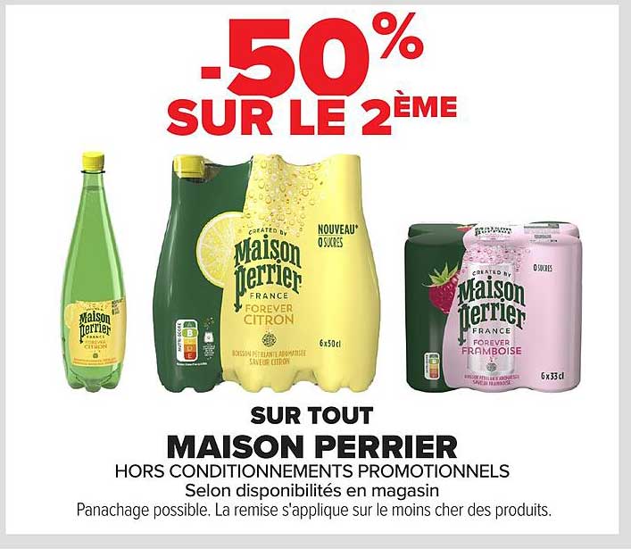 La marque Maison Perrier vous propose une offre exceptionnelle ! Profitez de -50% sur le deuxième produit de la gamme Maison Perrier. Que vous soyez amateur de la célèbre eau gazeuse ou que vous souhaitiez découvrir les nouvelles saveurs, c'est le moment idéal pour faire le plein. Cette offre est valable du 21 octobre au 3 novembre 2025, alors n'attendez plus !