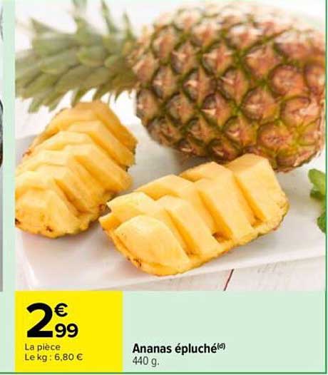 Découvrez l'offre exceptionnelle sur l'ananas épluché disponible chez Carrefour ! Profitez de ce fruit tropical savoureux et juteux, parfait pour vos smoothies, desserts ou simplement à grignoter à tout moment de la journée. Avec des goûts rafraîchissants et une texture délicieuse, cet ananas épluché est le choix idéal pour égayer vos repas. Ne manquez pas cette opportunité de vous régaler !