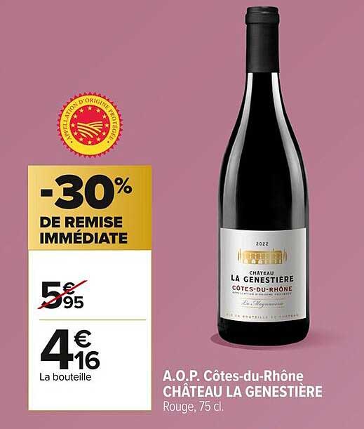Découvrez dès maintenant la offre A.O.P. Côtes-du-Rhône CHÂTEAU LA GENESTIÈRE dans le catalogue de Carrefour. Cette offre est valable du 02/12/2025 au 15/12/2025.