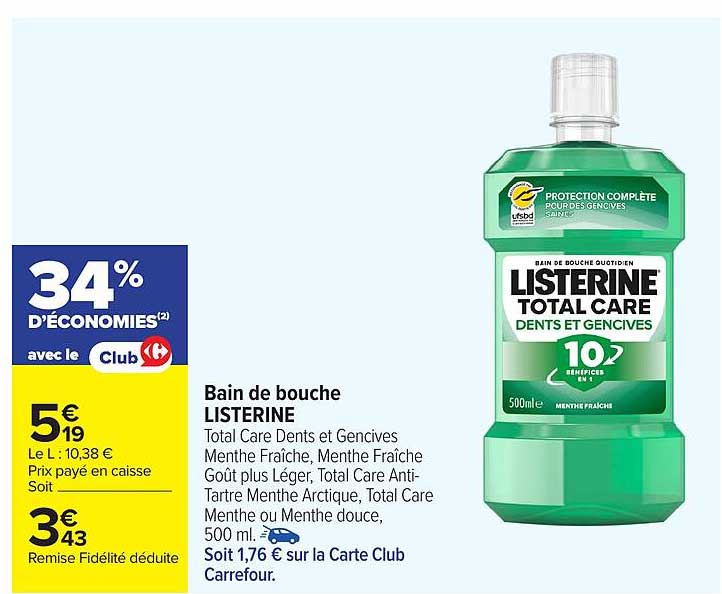 Découvrez l'offre exceptionnelle sur le Bain de bouche LISTERINE, valable du 7 au 20 octobre 2025. C'est le moment idéal pour prendre soin de votre santé bucco-dentaire, tout en réalisant de belles économies ! Avec une formule qui offre 10 bénéfices, ce produit est parfait pour garder une haleine fraîche et des dents saines.